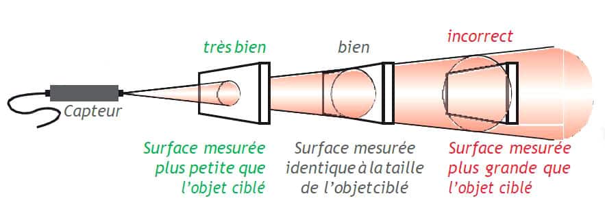 Il faut maintenir une distance appropriée selon les recommandations du fabricant : La précision de la mesure dépend du rapport distance/point de mesure (D:S) de l’appareil. Assurez-vous que la cible est plus grande que le point de mesure du thermomètre. Plus la cible est petite, plus vous devez vous rapprocher pour obtenir une mesure précise. Plus loin vous prendrez la mesure, plus large sera le spectre mesuré donc moins précise sera la mesure. Respectez bien la distance à la cible indiquée sur la fiche technique de l’appareil !