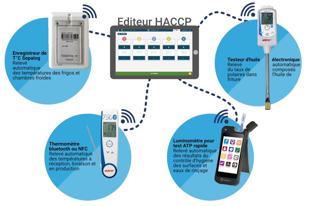 Nous proposons des appareils qui s’intègrent aux logiciel HACCP de gestion des PMS afin de faciliter la gestion des relevés obligatoires : Thermomètres Bluetooth, contrôle d’hygiène avec luminomètre Wifi, testeur d’huile connecté (en développement), enregistreur de température pour chambre froide Sopalog RF et nous avons des partenariats avec des fournisseurs de logiciel HACCP et de gestion du Plan de Maîtrise Sanitaire sur tablette.
